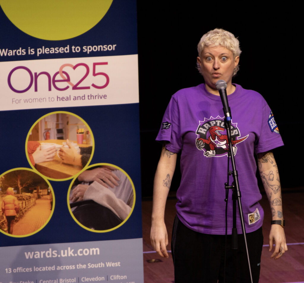 2026 marked our third year of Hysterical! Dani Johns, Bristolian comedian and returning One25 comedy legend expertly hosted the night. She was welcome to the stage by our roaring crowd, cracking jokes about all things Bristol, and executed some fabulous crowd work. One notable interaction was with an amazing gentleman who had travelled all the way from Birmingham to come and see the show! Dani’s hosting was gert lush: she did a properrrrr job.